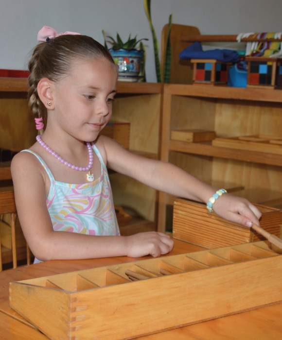 Los estantes de los materiales Montessori de desarrollo, se encuentran en niveles accesibles para su disponibilidad y autocorrección, llevando a los niños a trabajar en forma independiente y en silencio, usando el material con un sentido de perfección y orden para contribuir a la concentración y a la autodisciplina. Debido a que los materiales están diseñados científicamente, los niños adquieren habilidades como: escritura, lectura y matemáticas de forma natural, preparándolos para el nivel de primaria